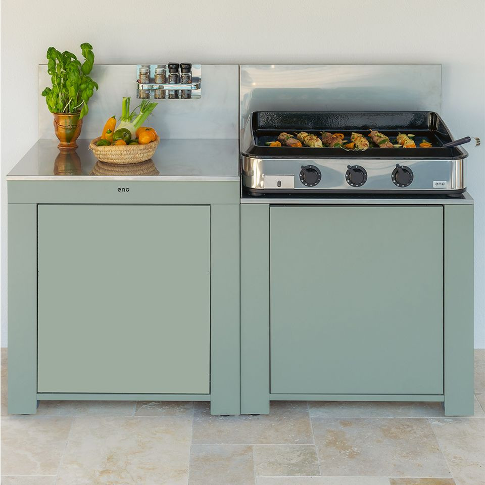 Vigyen stílust és funkcionalitást kertjébe a legújabb trend szerinti zsályazöld kültéri konyhaelemmel! Ez a prémium moduláris elem rozsdamentes acél munkapulttal nemcsak esztétikus, de rendkívül tartós megoldás a szabadtéri sütés-főzéshez.
